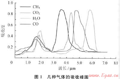 每種氣體都有自己的特征紅外吸收頻率,不受其他氣體吸收峰的干擾,吸收的能量與氣體在紅外光區(qū)內(nèi)的濃度有關(guān),大部分光學(xué)甲烷檢測儀就是據(jù)此來進(jìn)行設(shè)計(jì)的[10]。甲烷(CH4)分子的光譜吸收區(qū)為3.26μm,在3.26μm附近,C0、C02和H2O分子等沒有明顯吸收,對甲烷氣體檢測的影響幾乎可以忽略。由lambert-beer定律可知,當(dāng)一定頻率強(qiáng)度為I0的入射紅外光穿過氣體時(shí),氣體吸收自己特征頻率紅外光的能量后,而使出射光能量減弱為I,即吸收度I=I0exp(-μCL),其中μ為氣體吸收系數(shù);C為待測氣體濃度;L為光程長度。CH4、C02、C0和H2O的吸收峰圖如圖1所示。