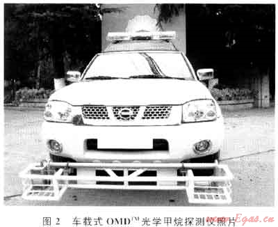 車載式OMDTM光學(xué)甲烷探測儀是專門為埋地天然氣管網(wǎng)及集輸管線設(shè)計(jì)的氣體檢漏裝置,其照片如圖2所示。紅外燈柱探測器安裝在檢測車前,可在各種環(huán)境條件下運(yùn)行,不會因光柱上的塵土雪水等而引起吸收頻率的微小波動;檢測儀響應(yīng)速度快,可檢測低于1ppm(1ppm=1mg/kg,下同)濃度的甲烷泄漏,速度高達(dá)10000次/s,且穩(wěn)定性好,自身不會引起檢測系統(tǒng)發(fā)熱,系統(tǒng)工作穩(wěn)定性好。另外,0MDTM內(nèi)部有刻度校準(zhǔn)器,能夠在任何時(shí)間檢驗(yàn)探測儀和設(shè)備是否正常運(yùn)行,檢測數(shù)據(jù)和GPS數(shù)據(jù)通過端口與PC連接便于數(shù)據(jù)分析與存儲。