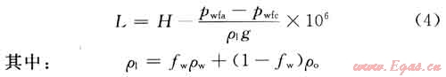 式中L為油管中積液的深度,m;H為產(chǎn)層中部深度,m;pwfa實(shí)測(cè)井底流壓,MPa;pwfc為計(jì)算得到井底流壓,MPa;ρ1為地層產(chǎn)液的密度,kg/m3;ρo為地層產(chǎn)液中油的密度,kg/m3;ρw為地層產(chǎn)液中水的密度,kg/m3;fw為地層產(chǎn)液的含水率。