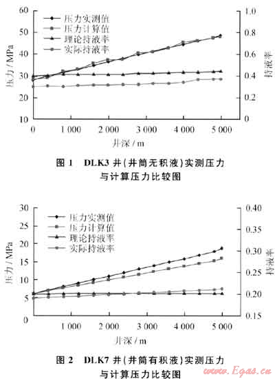 利用式(3)選定的模型,筆者在對(duì)該區(qū)塊大量井井筒壓力分析計(jì)算時(shí)發(fā)現(xiàn):①井筒不積液時(shí),計(jì)算壓力分布曲線與實(shí)測(cè)壓力分布曲線吻合較好(圖1),其實(shí)際持液率小于理論持液率[2],井筒無(wú)積液。大澇壩多口井計(jì)算表明,當(dāng)井筒無(wú)積液時(shí),其優(yōu)選模型的計(jì)算壓力與實(shí)測(cè)壓力的平均誤差2%。②當(dāng)井筒有積液時(shí),計(jì)算壓力低于實(shí)測(cè)壓力且誤差較大(圖2),其實(shí)際持液率小于理論持液率,井筒有積液。