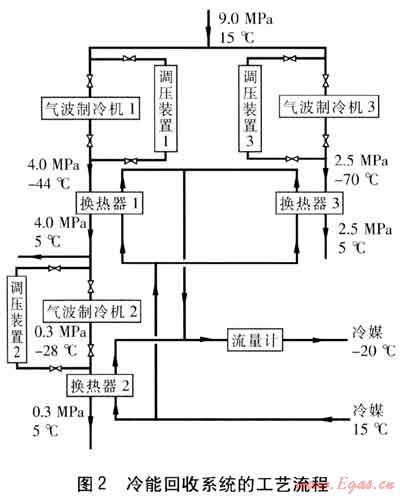 采用氣波制冷機作為冷能回收裝置,將啤酒公司冷媒引入門站內換熱器換熱,構成冷能回收系統(tǒng),工藝流程見圖2。