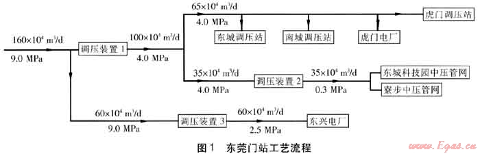 上游長輸管道的來氣抵達東莞分輸站后,經過濾、計量后送達東莞門站,天然氣在門站內經過必要的處理,依據需要被調節(jié)成不同壓力,分別送往相應的用戶或管網。按照設計,東莞門站天然氣處理總量為160×104m3/d,天然氣進站溫度為15℃、壓力為9.0MPa。