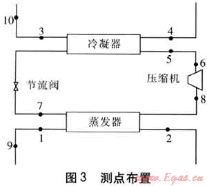 為了研究空調(diào)系統(tǒng)運行參數(shù)與故障之間的關(guān)系,挑選出對故障敏感的運行參數(shù),測點的選擇應(yīng)基于整個空調(diào)系統(tǒng),包括冷卻水側(cè)、冷水側(cè)及制冷劑側(cè)。由上述理論分析可知,冷水機組冷凝器水側(cè)受阻將引起蒸發(fā)溫度、冷凝溫度、壓縮機吸氣溫度、壓縮機排氣溫度、冷水供回水溫度、冷卻水進出水溫度發(fā)生變化,因此應(yīng)對這些參數(shù)進行測量。測點的布置見圖3,測量的參數(shù)名稱、測點位置及測量方式見表2。