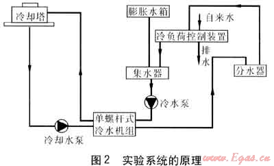實驗系統(tǒng)的原理見圖2。制冷機房中設(shè)置單螺桿式冷水機組、冷水泵和冷卻水泵各1臺,以及分水器和集水器。冷卻水經(jīng)冷卻水泵加壓后進入冷水機組,吸收熱量后被送至屋頂?shù)睦鋮s塔,經(jīng)冷卻降溫后又返回冷水機組,完成循環(huán)。冷水則是經(jīng)過冷水泵加壓后進入冷水機組,被冷卻降溫后進入分水器,之后進入冷負荷控制裝置中,與自來水混合后進入集水器,再被加壓送入冷水機組,完成循環(huán)。