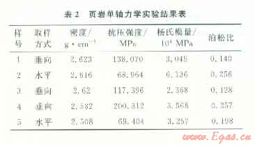 實驗結(jié)果表明,水平方向取樣的巖樣平均楊氏模量為4.70×104 MPa,抗壓強度為69.18 MPa,平均泊松比為0.227;垂直方向取樣的巖樣平均楊氏模量為2.99×104MPa,抗壓強度為l51.92 MPa,平均泊松比為0.175(表2)。