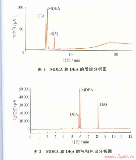 根據(jù)相關(guān)國(guó)家標(biāo)準(zhǔn),測(cè)定MDEA含量可采用酸堿中和滴定法。但混合胺采用此法只能測(cè)定出總胺含量,而對(duì)MDEA和DEA的單獨(dú)含量無法測(cè)定。采用氣相色譜法可以簡(jiǎn)單、快速、準(zhǔn)確地測(cè)出MDEA和DEA的各自含量[1]。在用氣相色譜儀對(duì)混合溶液進(jìn)行定量之前,先用質(zhì)譜儀對(duì)溶液進(jìn)行定性[2]。