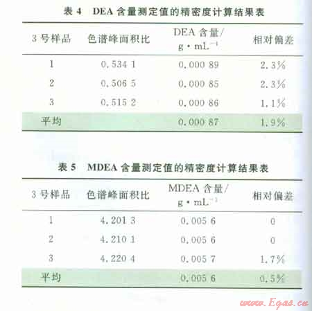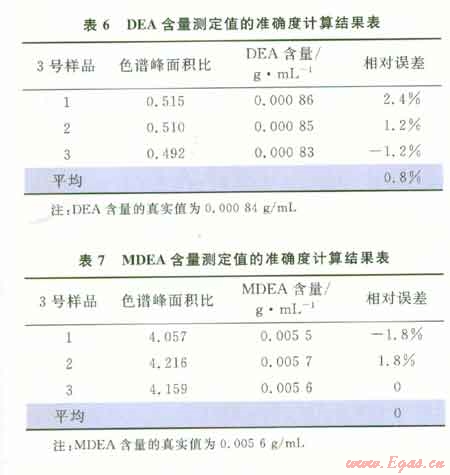 由表4和表5可以看出DEA含量測(cè)定值的相對(duì)偏差是1.9%,MDEA含量測(cè)定值的相對(duì)偏差是0.5%,表明該方法精密度較高。