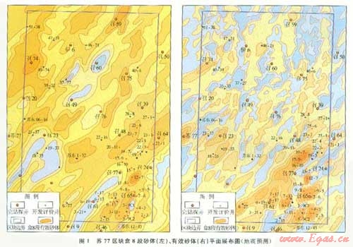 以河道帶為主要背景,以沉積相為指導,結(jié)合地震預測結(jié)果,勾繪出蘇77區(qū)塊主力儲層段砂體及有效砂體厚度等值線圖(圖2)。