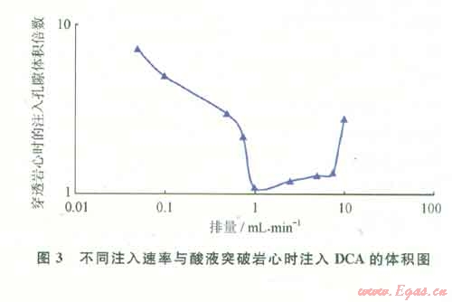選用滲透率為5~120 mD的石灰?guī)r巖心,以某一恒定的流量注入DCA就地自轉向酸,計量酸液穿透巖心的酸液體積(孔隙體積的倍數(shù))。得到以碳酸鹽巖心注酸流量為自變量時,蚓孔突破巖心需要酸液量占孔隙體積的倍數(shù)(PV)。圖3給出了滲透率范圍為5~120 mD的石灰?guī)r巖心以不同流量下注入DCA自轉向酸突破時的注入酸液孔隙體積倍數(shù)。實驗結果表明:①注入DCA體系表現(xiàn)出突破孔隙體積與注酸流量存在一定關系;②注酸速率在0.05~1.0mL/min范圍,隨著注酸速率增大,穿透巖心所需的DCA酸液體積減少;③注酸速率在1.0~7.5mL/min范圍,隨著注酸速率增大,穿透巖心所需的DCA酸液體積呈增加趨勢,但增加幅度不大;④注酸速率在7.5~10.0mL/min范圍,隨著注酸速率增大,穿透巖心所需的DCA酸液體積大幅度增加;⑤最佳的注酸流量為1mL/min,酸液突破最小注酸體積倍數(shù)為1.2 PV。
