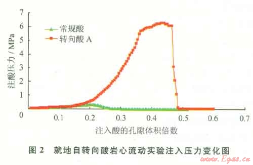 巖心實驗結果表明:就地自轉向酸注入壓力先隨注入體積的增大而增大,當注入一定量時,注入壓力急劇升高,最大增加到6.3MPa,是初始注酸壓力0.1MPa的近60倍;自轉向的注入壓力是常規(guī)酸注入壓力的20倍左右,自轉向酸具有明顯的轉向性能(圖2)。