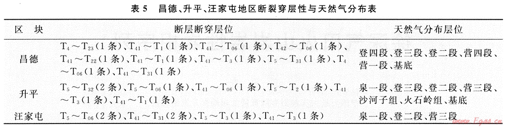 由表2中可以看出,徐家圍子斷陷以登二段為界下部主要發(fā)育的是從基巖或沙河子組或營(yíng)城組斷至T32之下的斷裂,上部主要發(fā)育T32~T2、T31~T2、T3~T2的斷裂。斷裂的這一分布特征使得登二段以上蓋層被斷裂破壞程度小,使得其下天然氣大規(guī)模富集。然而,在升平、汪家屯和昌德地區(qū)局部發(fā)育有穿過登二段蓋層的斷裂,昌德地區(qū)有10條,升平地區(qū)有7條,汪家屯地區(qū)有9條(表5)。正是這些斷裂的溝通作用,使得登二段蓋層之下的部分天然氣在這些地區(qū)沿?cái)嗔汛┻^登二段蓋層向上運(yùn)移,聚集在登三、四段地層和泉一、二段地層中,形成升平、汪家屯和昌德上部氣藏。而其他地區(qū)因無(wú)此類斷裂,天然氣不能穿過登二段蓋層向上運(yùn)移聚集成藏,只能在登二段蓋層之下聚集成藏。