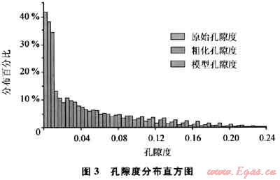 2) 統(tǒng)計(jì)特征對(duì)比。對(duì)比建立的孔隙度、滲透率、含氣飽和度等儲(chǔ)層參數(shù)的模型統(tǒng)計(jì)特征和輸入的原始測(cè)井解釋數(shù)據(jù)及其粗化后的數(shù)據(jù)(圖3),可以看出地質(zhì)模型儲(chǔ)層參數(shù)與原始數(shù)據(jù)的統(tǒng)計(jì)分布特征基本一致。