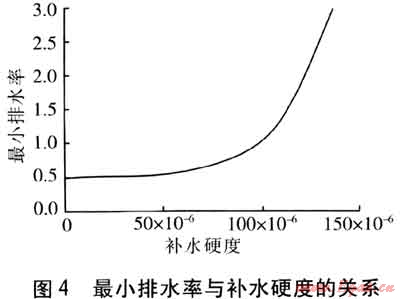 對蒸發(fā)冷卻系統(tǒng)而言,由于水不斷蒸發(fā),溶于水中的礦物質(zhì)會析出并沉積在濕簾表面上形成水垢。濕簾表面大量的水垢會影響濕簾的蒸發(fā)冷卻效率和使用壽命。目前,在燃氣輪機進氣冷卻系統(tǒng)中,一般針對不同的補水硬度(以CaC03計,質(zhì)量分數(shù))通過控制排水率(即排水質(zhì)量與蒸發(fā)水質(zhì)量之比)的方法來抑制水垢的產(chǎn)生。最小排水率通常采用圖4的曲線來確定[3]。