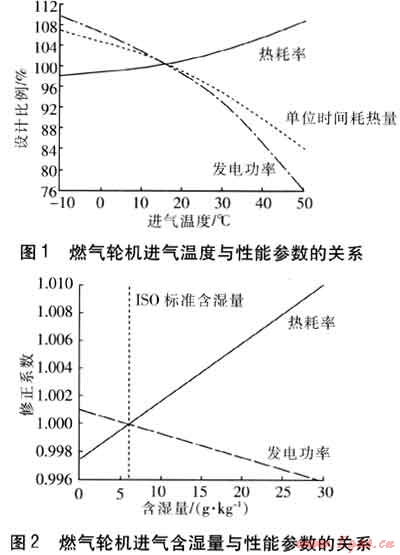 PG6111FA型燃氣輪機發(fā)電機組的標準工況(額定工況)為:環(huán)境溫度為15℃,大氣絕對壓力為97.8kPa、相對濕度為48%(即含濕量為5.25g/kg)。在標準工況下,該燃氣輪機發(fā)電功率為73640kW,單位時間耗熱量為750.4×106kJ/h,熱耗率(指每生產(chǎn)1kW·h電所消耗的熱量)為10190kJ/(kW·h),排氣質(zhì)量流量為735.3×103kg/h,排氣溫度為600.6℃,燃料是天然氣。在非標準工況下(環(huán)境相對濕度為48%,大氣絕對壓力為97.8kPa),燃氣輪機進氣溫度與性能參數(shù)的關(guān)系見圖1,圖1中設(shè)計比例是指燃氣輪機非標準工況下的性能參數(shù)與標準工況下的性能參數(shù)之比。在環(huán)境溫度為15℃、大氣壓力為97.8kPa時,燃氣輪機空氣進氣含濕量與性能參數(shù)的關(guān)系見圖2,圖2中含濕量是每1kg干空氣中含有水的質(zhì)量,修正系數(shù)是指非IS0標準空氣進氣含濕量時燃氣輪機的性能參數(shù)與IS0標準空氣進氣含濕量下燃氣輪機的性能參數(shù)之比。
