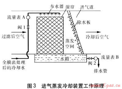進氣蒸發(fā)冷卻裝置工作原理見圖3。它由濕簾、布水器、除水板、水箱及一些附屬設(shè)備組成。其工作原理是:經(jīng)全膜法處理后的冷卻水經(jīng)閥1調(diào)節(jié)送至濕簾頂部的布水器后均勻地灑在濕簾表面,由于重力作用冷卻水自上往下如水簾灑下??諝馐紫冉?jīng)過濾器過濾,除去雜質(zhì),然后再進入蒸發(fā)冷卻裝置,與濕簾中自上而下的冷卻水進行熱濕交換。部分水因吸收空氣的顯熱汽化蒸發(fā)后變成水蒸氣,未蒸發(fā)的水流回水箱,排出后用于其他用途??諝庖蚴ワ@熱而溫度降低,同時因融進了部分水蒸氣而使其相對濕度增加??諝馀c水蒸氣的混合物流向下游的除水板,其中的小水滴和部分水霧在除水板上凝結(jié)成大水滴,并在重力的作用下落入水箱,降低了進氣的攜水率,減少了壓氣機因進氣空氣水量增加而導致的負荷消耗;同時空氣中的微小塵埃也隨水滴落入水箱,淋灑下來的冷卻水對空氣還起到了水洗除塵的輔助效果,避免了進氣中的微量雜質(zhì)對燃氣輪機葉片的腐蝕。