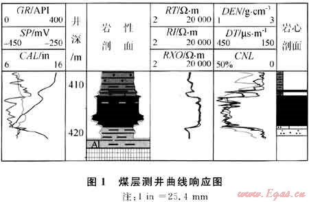 由于煤巖所具有的特殊屬性,煤層的測井響應很特殊,比圍巖較易識別,具體表現(xiàn)為“三高兩低”的特征,即:高電阻、高聲波時差、高中子、低伽馬、低體積密度(圖1)。