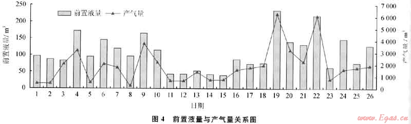 在韓城地區(qū),通過對33口井(其中30口使用活性水壓裂液,3口井使用清潔壓裂液)的排采效果進行統(tǒng)計分析,結(jié)果表明:采用活性水壓裂液壓裂的井比用清潔壓裂液的井產(chǎn)氣效果好;產(chǎn)氣量和前置液量具有很好的正相關關系(圖4);加砂量和產(chǎn)氣量也具有一定的正相關關系,但砂比和產(chǎn)氣量之間沒有很明顯的相關性。