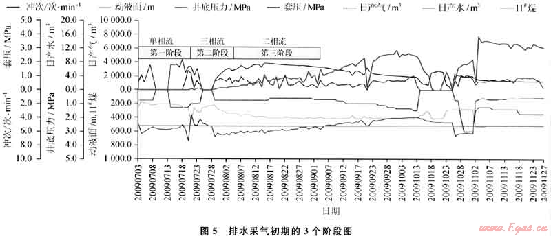 根據(jù)韓城地區(qū)的實際條件,經(jīng)過不斷摸索,制訂出適合于韓城地區(qū)的一套排采制度:①在排采初期第一階段,低排采強度持續(xù)10~15d,使地層重新建立壓力場平衡,掌握地層的供液能力;②在第二階段,井底流壓接近煤層臨界解吸壓力,這是排采初期的關鍵時刻,應適當加大排采強度,盡可能地將近井地帶的煤粉和壓裂過程中形成的遠端煤粉排出,疏通近井地帶的高滲流通道;③第三階段主要是氣、液兩相滲透率反復變更階段(圖5),排采時應保持液面的平穩(wěn)下降,不能造成壓力激動而打破地下重新形成的壓力場,導致遠端滲流通道閉合,滲透率降低,這一過程一般持續(xù)時間達一個月。