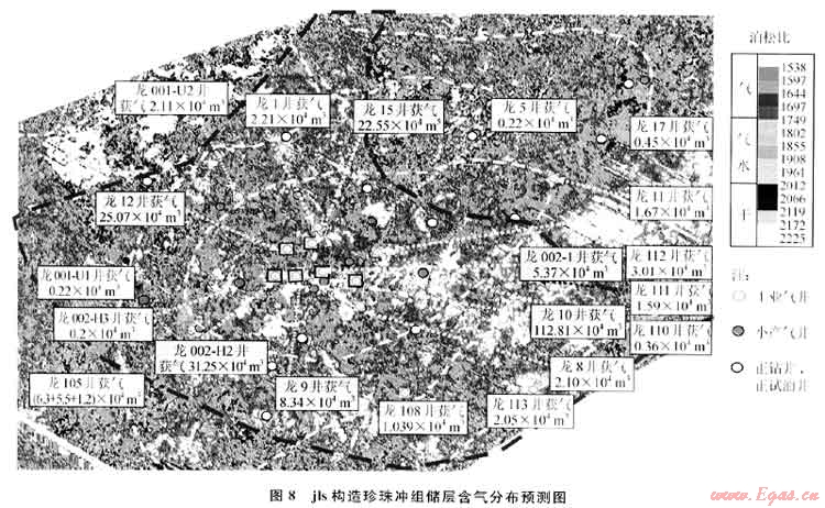 圖9為lg構(gòu)造二疊系生物礁儲層氣水分布預(yù)測圖。該圖展示,構(gòu)造中部北東南西向有一明顯分界線,西南(左下半部)為臺地相沉積區(qū),西北部為海槽,中間為臺緣。預(yù)測臺地為含水及差儲層區(qū),中間為臺緣部位,為預(yù)測的含氣帶,東北部為海槽,預(yù)測出大片含氣區(qū)。該構(gòu)造儲層段鉆探大量井位,前期在臺緣部位取得較好效果,高產(chǎn)井較多(黃色、綠色文字框所示),但后來鉆遇大量氣水井或水井(綠色或藍(lán)色文字框所示),尤其在臺地部位部署的井位基本上為干井或水井(白色或藍(lán)色文字框所示),獲氣井很少。氣水預(yù)測結(jié)果與實鉆結(jié)果基本吻合。預(yù)測還表明,該區(qū)海槽部位還有大片含氣區(qū),但該區(qū)僅有l(wèi)g10井鉆達(dá)目的層,且不產(chǎn)氣,雖然該井預(yù)測與實鉆吻合,但沒有更多的井來證實,且該區(qū)儲層情況還存在認(rèn)識上的爭議,要靠將來的實鉆進(jìn)一步驗證。