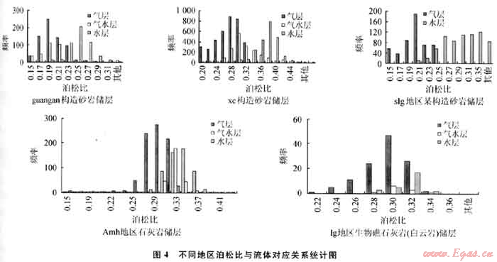 圖4為國內(nèi)外某些地區(qū)儲層泊松比測井資料與流體對應(yīng)關(guān)系統(tǒng)計圖。從圖中可見,盡管地區(qū)不同,儲層類型不同,但氣水關(guān)系始終具有一致特點,即低泊松比對應(yīng)含氣,中泊松比對應(yīng)同含氣水,中高泊松比對應(yīng)含水,高泊松比對應(yīng)巖層。與前人研究成果都是一致的,只是具體儲層情況有分布范圍的差別。這也說明泊松比這些特點是由儲層及流體的物理性質(zhì)決定的,這種明確的關(guān)系確保了應(yīng)用泊松比進(jìn)行流體識別的可靠性。