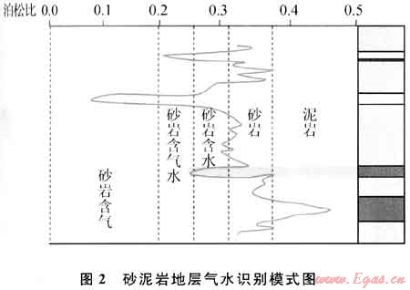 圖2表明,泊松比最低對應(yīng)氣;泊松比次低對應(yīng)氣水;泊松比中等對應(yīng)水;泊松比中高對應(yīng)砂巖致密層;泊松比很高對應(yīng)泥巖層。模式中泊松比值的大小具有相對性,即在不同儲層中,其值的分布范圍及劃分界限可能有所不同。碳酸鹽巖地層(石灰?guī)r及白云巖為主)具有相似的模式,只是巖性和泊松比值大小有區(qū)別。