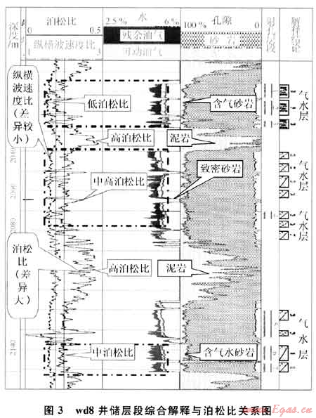 圖3為四川盆地wd8井測井綜合解釋圖。該網(wǎng)直觀展示出泊松比曲線與巖性、流體具有明顯的對應(yīng)關(guān)系,且與前人研究結(jié)論完全一致。