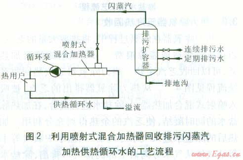 利用噴射式混合加熱器回收排污閃蒸汽,加熱供熱循環(huán)水,工藝流程見(jiàn)圖2。鍋爐的排污水進(jìn)人排污擴(kuò)容器后,由于壓力降低,產(chǎn)生閃蒸汽,將閃蒸汽引入噴射式混合加熱器,加熱供熱循環(huán)水。