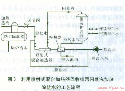 利用噴射式混合加熱器回收排污閃蒸汽,加熱除鹽水[7],工藝流程見(jiàn)圖3。在排污擴(kuò)容器內(nèi)閃蒸降壓后的排污水,經(jīng)換熱器與除鹽水換熱,閃蒸汽通過(guò)噴射式混合加熱器再次加熱除鹽水。加熱后的除鹽水,進(jìn)入熱力除氧器除氧后作為鍋爐供水。