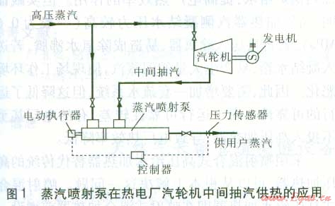 在工業(yè)生產(chǎn)過(guò)程中,不同的工藝過(guò)程往往需要不同壓力的蒸汽,而熱電廠、鍋爐房供應(yīng)的蒸汽壓力通常比較單一。傳統(tǒng)方法是通過(guò)蒸汽的減溫減壓,滿足熱用戶(hù)對(duì)蒸汽參數(shù)的要求。但是,這種方式易造成蒸汽品位的降低。蒸汽壓力匹配技術(shù)就是為滿足熱用戶(hù)對(duì)蒸汽不同壓力等級(jí)需求而開(kāi)發(fā)的技術(shù),它在實(shí)現(xiàn)節(jié)能的同時(shí)合理利用蒸汽裕壓,通過(guò)蒸汽噴射泵利用高壓蒸汽引射低壓蒸汽,在降低高壓蒸汽壓力的同時(shí)提高低壓蒸汽的壓力。通過(guò)設(shè)備的結(jié)構(gòu)設(shè)計(jì)和蒸汽流量調(diào)節(jié),產(chǎn)生介于高、低壓蒸汽壓力之間的各種壓力的蒸汽,滿足用戶(hù)的要求。蒸汽噴射泵在熱電廠汽輪機(jī)中間抽汽供熱的應(yīng)用見(jiàn)圖l。鍋爐供應(yīng)的高壓蒸汽進(jìn)入蒸汽噴射泵,通過(guò)引射作用,將汽輪機(jī)中間抽汽(低壓蒸汽)吸人蒸汽噴射泵,最后向用戶(hù)供應(yīng)一定壓力的蒸汽。由壓力傳感器、控制器、電動(dòng)執(zhí)行器組成的自動(dòng)控制系統(tǒng),通過(guò)測(cè)量蒸汽噴射泵出口蒸汽壓力的變化,調(diào)節(jié)進(jìn)入蒸汽噴射泵的高壓蒸汽流量,保持蒸汽噴射泵出口蒸汽壓力的穩(wěn)定,滿足用戶(hù)對(duì)蒸汽壓力的需要。