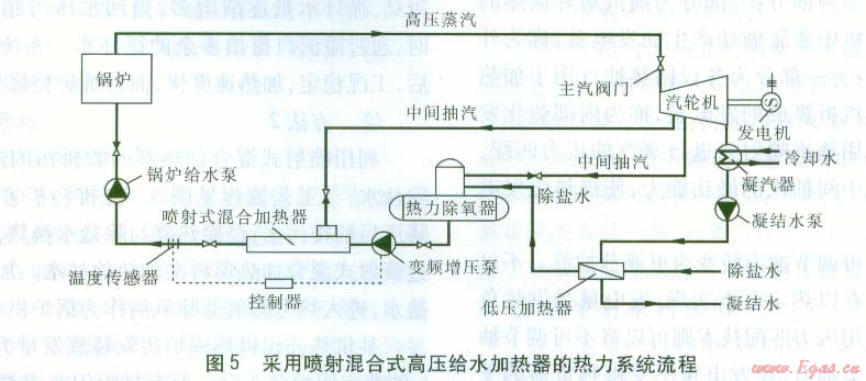 采用噴射混合式高壓給水加熱器替代傳統(tǒng)的高壓加熱器,可以從根本上解決這一問(wèn)題。噴射混合式高壓給水加熱器即在噴射式混合加熱器前增設(shè)一臺(tái)變頻增壓泵(見(jiàn)圖5)。由于汽水直接混合,因此噴射混合式高壓給水加熱器換熱效率較高。由于不存在結(jié)構(gòu)復(fù)雜的高壓加熱器疏水系統(tǒng),運(yùn)行可靠性得到大幅提高。