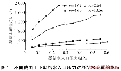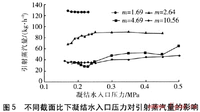② 相同凝結(jié)水入口壓力下,不同截面比的引射混合式低壓加熱器引射蒸汽量不同。截面比小的,工作噴嘴出口直徑大,凝結(jié)水流量也大,產(chǎn)生的負壓及引射蒸汽量也大。