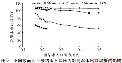 不同截面比下凝結(jié)水入口壓力對高溫水出口溫度的影響見圖6。高溫水出口溫度取決于引射蒸汽量和凝結(jié)水流量,是考察引射混合式低壓加熱器加熱性能的重要指標之一。由圖6可知,隨著截面比的改變,高溫水出口溫度變化較大。當截面比m=1.69時,高溫水出口溫度比其他3組試驗值低。由圖4、5可知,在4組試驗數(shù)據(jù)中,截面比m=1.69時的凝結(jié)水流量最大、引射蒸汽量最高,但增大的引射蒸汽量不足以抵消凝結(jié)水流量增大的影響,因此高溫水出口溫度最低。高溫水出口溫度最高的是截面比m=10.56的引射混合式低壓加熱器,高溫水出口溫度可達110℃。由此可知,對于引射混合式低壓加熱器性能的考察要全面,不能只關(guān)注引射蒸汽量,應(yīng)綜合考察其加熱性能,選擇合適的截面比,這樣才能獲得較高溫度的高溫水。