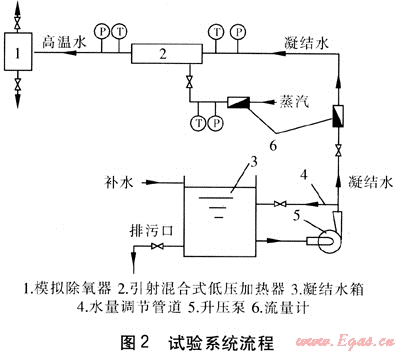試驗?zāi)M小型火電廠裝機容量為6MW的發(fā)電機組低壓加熱器的工況,被引射蒸汽壓力為0.18~0.20MPa,試驗過程中調(diào)節(jié)凝結(jié)水入口壓力,變化范圍為0.04~0.60MPa。試驗系統(tǒng)流程見圖2,溫度、壓力采集點緊鄰引射混合式低壓加熱器進出口,確保采集結(jié)果接近實際。試驗過程中溫度、壓力采用人工記錄與模塊化數(shù)據(jù)采集兩種方式。