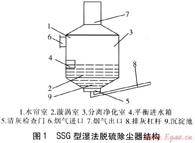 SSG型濕法脫硫除塵器主要包括水簾室、漩渦室、分離凈化室3部分,另配平衡進水箱、清灰檢查門、沉淀池。SSG型濕法脫硫除塵器結(jié)構見圖1。