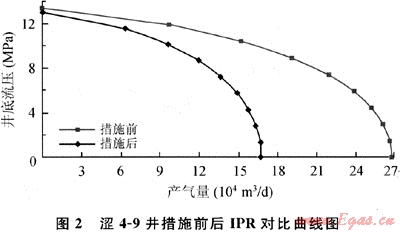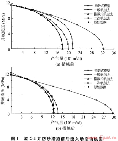 4-9井在2003年9月28日實施高壓一次充填作業(yè),并且分別在防砂前20Q3年8月12日和防砂后2003年11月24日進(jìn)行了產(chǎn)能試井,對試井資料使用一般單點法、指數(shù)式單點法和二次單點法進(jìn)行分析處理,得出措施前后的IPR對比曲線如圖2所示。