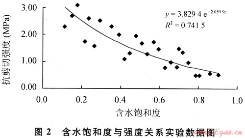 實(shí)驗(yàn)樣品的抗剪切強(qiáng)度與含水飽和度(泥質(zhì)含量30%)回歸關(guān)系式(圖2)為:
