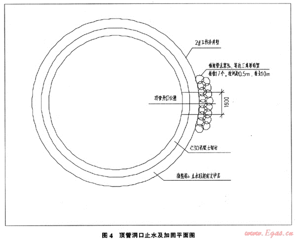 工作難點(diǎn):由于頂管洞口開口部位位于細(xì)砂層中,若直接在井壁開口將會(huì)有大量泥沙涌人作業(yè)井,引發(fā)地面塌陷。解決辦法:開口前。在支護(hù)結(jié)構(gòu)外圍施工兩排注漿孔,共17孔,采用袖閥管注漿法加固洞口外圍砂層,止水防滲。加固結(jié)構(gòu)見圖4。開口后洞口采用砌磚封門。