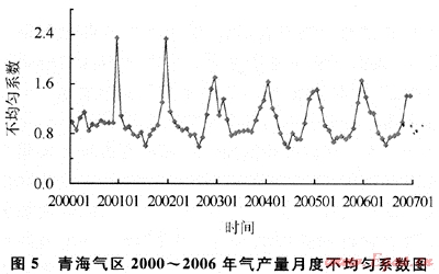 近幾年由于受國家經(jīng)濟宏觀調(diào)控政策和城市環(huán)保要求提高等因素的影響,民用、發(fā)電等用氣增長較快,但民用和采暖用氣的季節(jié)性不均勻問題突出,冬季高月和夏季低月值相差很大。中國石油每年的1、2、3、10、11、12等6個月的不均勻系數(shù)偏大(不均勻系數(shù)為月產(chǎn)量與年均月產(chǎn)量的比值),最高為12月份,連續(xù)6a的12月不均勻系數(shù)都在1.2以上,2005年不均勻系數(shù)達到了1.54的高峰,峰谷差為1.3~1.5倍(圖3)[4~5]。