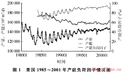 從美國的產(chǎn)能和產(chǎn)量的歷史關系可以看出(圖1)[1],1995年之前,當產(chǎn)能負荷因子(產(chǎn)量與產(chǎn)能的比值)在65%~90%時,存在上游調(diào)峰,產(chǎn)量出現(xiàn)季節(jié)性的波動;1995年以后,產(chǎn)能負荷因子迅速提升,當大于90%以后,產(chǎn)量不再隨季節(jié)波動,2000年以后產(chǎn)量和產(chǎn)能曲線基本吻合,產(chǎn)能不再留有富余。調(diào)峰用氣量主要靠儲氣庫和進口的天然氣[2]。