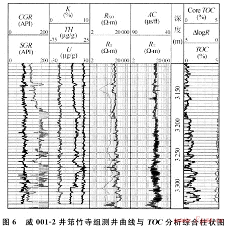 如前所述,隨深度的增加,筇竹寺組和龍馬溪組頁巖的顏色均具有自上而下逐漸加深的特點(diǎn),而其自然伽馬值和有機(jī)質(zhì)豐度也隨之逐漸增高(圖6)。威001-2是威遠(yuǎn)構(gòu)造上的一口新井,筇竹寺組的伽馬值在3175m以下明顯增加,一般都大于150API,而無論是根據(jù)測井曲線△㏒R(Passey,1989)計(jì)算的還是采用巖屑實(shí)測的TOC值,均顯示在該深度段以下一般都大于1.0%且逐漸增加的特征(圖6)。長寧構(gòu)造上最近由中石油北京勘探開發(fā)研究院鉆探的1口淺井也顯示出龍馬溪組頁巖所具有的上述特征。該口淺井鉆遇了龍馬溪組中下部黑色頁巖層,110m深度段以上的TOC值一般在1.5%~2.5%之間,該深度以下TOC值劇增,均大于3%,最高約9%。