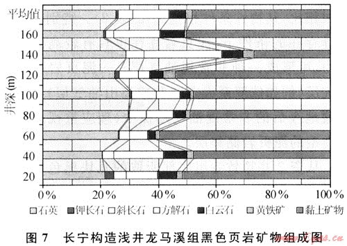 實(shí)際上,廣義的頁巖氣還應(yīng)該包括儲(chǔ)存在黑色頁巖所夾的薄層泥質(zhì)粉砂巖和各種砂巖中的天然氣。這些泥質(zhì)粉砂巖和砂巖相對(duì)純頁巖而言有較多的孔隙,因此儲(chǔ)存于其中的天然氣多為游離氣,可隨頁巖中的吸附氣一并采出。四川盆地這兩套黑色頁巖普遍含砂質(zhì),淺色石英粉砂微細(xì)紋層與暗色泥質(zhì)層交互沉積而顯水平紋理,石英分布不均,局部富集而成泥質(zhì)粉砂巖。此外,頁巖中還微含鈣質(zhì),底部多含硅質(zhì),黃鐵礦也較豐富,多呈星散狀分布。對(duì)長寧構(gòu)造龍馬溪組黑色頁巖巖心樣品的礦物成分分析結(jié)果也表明,石英含量在20%~30%之間,方解石和白云石含量多在10%~25%,高者可達(dá)35%,黃鐵礦含量在1%~4%之間(圖7)。由于黑色頁巖砂質(zhì)和鈣質(zhì)較重,因此其性較脆、硬,在加砂壓裂中容易產(chǎn)生裂縫,這對(duì)于頁巖氣的開采極為有利。
