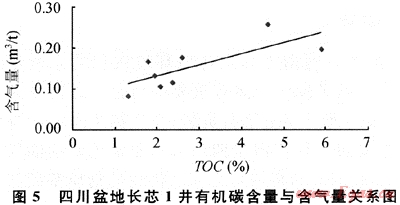 頁巖氣的勘探生產(chǎn)價值取決于其中游離氣和吸附氣的含量,游離氣的含量高低與其構(gòu)造保存條件密切相關(guān),而吸附氣含量受溫度、壓力等環(huán)境因素影響,在相同情況下,吸附氣量高低與有機質(zhì)含量呈正相關(guān)。上揚子地區(qū)志留系烴源巖有機質(zhì)豐度高,預(yù)計將會在構(gòu)造保存條件差異較大的地區(qū)分別形成不同含氣量及含氣特點的頁巖氣聚集。在四川盆地,除已發(fā)現(xiàn)過去的老井在鉆探志留系頁巖段時具有豐富的氣顯示之外,目前完鉆的長芯1井初步分析結(jié)果顯示,在埋深淺于150 122龍馬溪組頁巖層段內(nèi),同樣發(fā)現(xiàn)了頁巖氣存在的證據(jù)(表2)。8個頁巖巖心的含氣量實驗結(jié)果顯示(解析溫度70℃),每噸巖石含氣量為0.08~0.25m3,平均為0.15m3/t。另從110m和120m巖樣的甲烷碳同位素分別為-40.2‰和-52.3‰來看,頁巖氣應(yīng)為熱成因的天然氣。有機質(zhì)豐度與含氣量的關(guān)系則顯示(圖5),同美國頁巖一樣,同樣具有有機碳含量與含氣量呈正相關(guān)的關(guān)系,即有機質(zhì)豐度越高,含氣量越大。