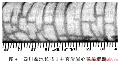 上揚子地區(qū)除四川盆地外,其余地區(qū)勘探程度非常低,且無論是四川盆地還是四川盆地以外的探區(qū),已往的油氣勘探實踐中,都沒有把頁巖地層當(dāng)做有效目的儲層對待。因此,開展頁巖儲層的研究甚少[3~4]。四川盆地長寧構(gòu)造所鉆的長芯1井8個志留系頁巖樣品的巖礦組成分析結(jié)果見表1。長寧構(gòu)造龍馬溪組頁巖巖礦組成中,黏土最多,含量為26.5%~59.5%,平均48.25%,其次是石英,含量為20.5%~29.7%,平均25.3%,方解石含量為4.1%~26.9%,平均12.4%。與美國已知含氣頁巖相比,該井硅質(zhì)(石英)含量偏少,而黏土(伊利石為主)含量偏高,根據(jù)美國經(jīng)驗,這似乎對頁巖儲層的脆性有影響。但仔細(xì)分析發(fā)現(xiàn),該井的方解石總量較高,石英和方解石總量達(dá)37%,表明該套頁巖具有脆性巖石組分。野外剖面可見風(fēng)化破碎的龍馬溪組筆石頁巖,且在露頭和長芯1井巖心上均可發(fā)現(xiàn)頁巖高角度縫和微裂縫十分發(fā)育(圖4),揭示了該區(qū)頁巖具有良好的脆性特征。
