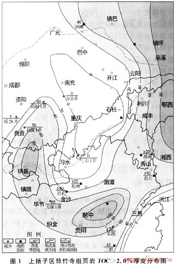 據(jù)Charles Boyer等(2006)[5]把源巖有機(jī)質(zhì)豐度定為6級,即TOC<0.5%為很差;0.5%~1%為差;1%~2%為一般;2%~4%為好;4%~12%為很好;TOC>12%為極好。美國從事頁巖氣藏勘探開發(fā)的油公司一般將有效頁巖TOC含量下限值確定為2.0%。筆者采用這一下限值,并依據(jù)上揚(yáng)子區(qū)下寒武統(tǒng)筇竹寺組頁巖TOC含量實測標(biāo)定資料及相應(yīng)厚度分布,編制了該區(qū)筇竹寺組頁巖TOC≥2.0%的頁巖厚度分布圖(見圖1)。