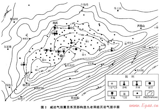 前已述及,威遠(yuǎn)氣田鉆穿下寒武統(tǒng)九老洞組的107口井中,有29口井在九老洞組頁巖中的不同井段出現(xiàn)了不同級別的天然氣顯示,筆者將這些顯示井分別標(biāo)注在威遠(yuǎn)氣田震旦系頂面構(gòu)造圖上(圖2)。由圖可見,九老洞組頁巖氣顯示井的平面分布及顯示特點(diǎn)與下伏震旦系氣井的分布控制因素完全不同。九老洞組頁巖中的氣顯示井不僅在構(gòu)造的軸部、翼部及氣水邊界內(nèi)有分布,尤其值得注意的是在該氣田氣水邊界外的東、西、南、北各個方向均有顯示井分布。如威遠(yuǎn)構(gòu)造西南的威18井已遠(yuǎn)離威遠(yuǎn)氣田的氣水邊界達(dá)16km,但在九老洞組的中部和下部還是出現(xiàn)了3個強(qiáng)烈的氣顯示井段(兩個氣顯示段達(dá)井涌、1段為氣侵)。其中3361.5~3363.5m顯示段,在鉆井過程中放空0.3m,并發(fā)生井涌。氣測全烴由55%增至100%,泥漿噴出轉(zhuǎn)盤面0.5m,氣侵、井涌猛烈,且持續(xù)井涌時間長達(dá)2a。
