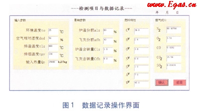 運用Matlab軟件對上述鍋爐熱效率計算數(shù)學模型進行編程,通過VB軟件進行可視化界面顯示,Matlab軟件與VB軟件通過Active X實現(xiàn)連接,可實現(xiàn)在線的數(shù)據(jù)傳遞和后臺的計算反饋。數(shù)據(jù)記錄操作界面見圖1(受實際情況限制,圖1中使用的名詞和量符號與文內(nèi)使用的名詞和量符號沒有完全對應(yīng))。