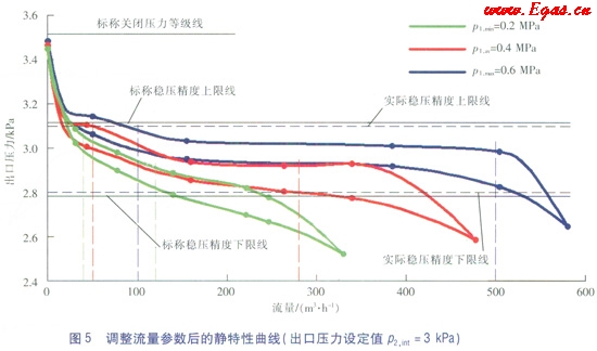 ②調(diào)壓器的靜特性與流量參數(shù)密切相關(guān):當(dāng)進出口壓力范圍不變時,在滿足標稱關(guān)閉壓力等級、標稱關(guān)閉壓力區(qū)等級和標稱靜特性曲線族關(guān)閉壓力區(qū)等級的條件下,通過適度地調(diào)整流量參數(shù),有可能使調(diào)壓器達到更高的穩(wěn)壓精度等級;通過降低標稱穩(wěn)壓精度等級和(或)標稱關(guān)閉壓力等級,可以在一定程度上拓寬調(diào)壓器的適用流量范圍。上述參數(shù)的調(diào)整需要通過試驗和作圖相結(jié)合的方法實現(xiàn)。