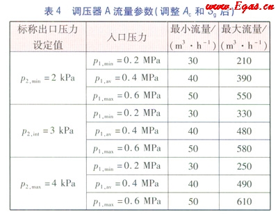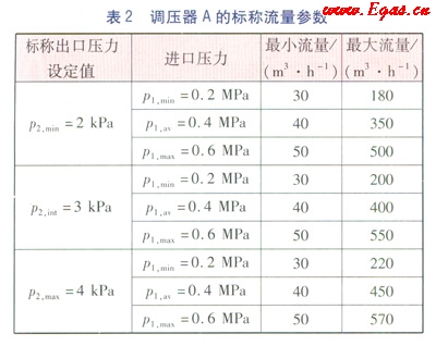 以一款直接作用式調(diào)壓器A為例,該調(diào)壓器的進口壓力范圍為dp1=0.2~0.6MPa(即p1,min=0.2MPa,p1,max=0.6MPa),出口壓力范圍dp2=2~4kPa(即p2,min=2kPa,p2,max=4kPa)。其標稱穩(wěn)壓精度等級Ac=10,標稱關(guān)閉壓力等級Sg=20,標稱關(guān)閉壓力區(qū)等級Sz=20,標稱靜特性曲線族的關(guān)閉壓力區(qū)等級Sz,p=20。相應(yīng)的標稱流量參數(shù)見表2。