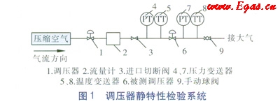 為了確保檢驗過程的安全性,調(diào)壓器靜特性檢驗的試驗介質(zhì)采用壓縮空氣。調(diào)壓器靜特性檢驗過程中,由調(diào)壓器1調(diào)節(jié)被測調(diào)壓器6的進口壓力,由壓力變送器4測量被測調(diào)壓器6的進口壓力值;通過手動球閥9來調(diào)節(jié)通過被測調(diào)壓器6的壓縮空氣流量,流量值由流量計2測量,同時讀取由壓力變送器7測得的被測調(diào)壓器6實時的出口壓力值。在檢驗過程中,進口切斷閥3保持開啟狀態(tài),檢驗結(jié)束后關(guān)閉進口切斷閥3。如果在檢驗過程中出現(xiàn)異常,則關(guān)閉進口切斷閥3,故障排除后再開啟進口切斷閥3繼續(xù)檢驗。溫度變送器5和8測量被測調(diào)壓器6進口和出口的壓縮空氣溫度。