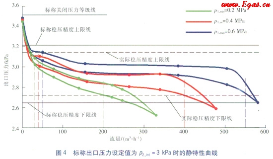調(diào)壓器A在上述標稱出口壓力設(shè)定值p2,int=3kPa參數(shù)條件下的靜特性曲線圖見圖4。